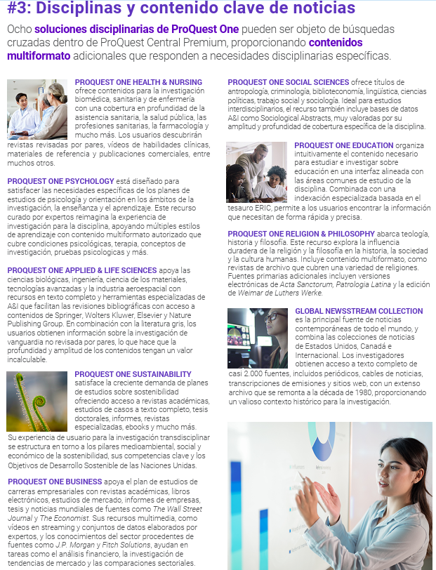 Acceso a ProQuest One por disciplinas: 8 plataformas temáticas Proquest One que permiten la búsqueda cruzada y ofrecen contenido multiformato.